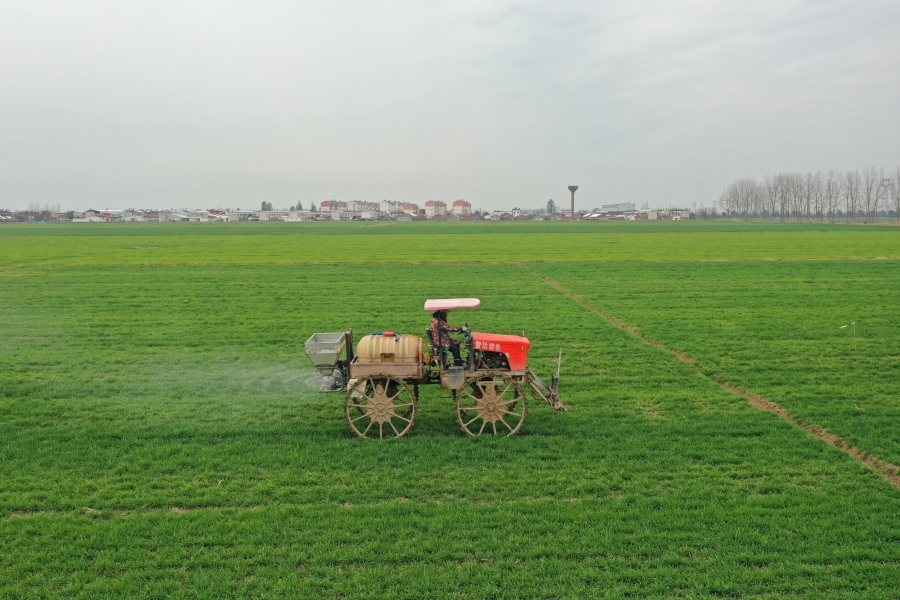 2月6日,安徽省宿松县复兴镇复兴社区的农田里,安徽农垦华阳河农场组织工作人员开展小麦施肥作业。