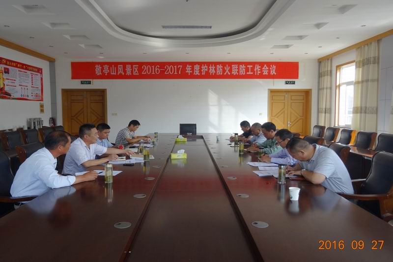 9月27日 ,敬亭山风景区护林防火联防工作会议召开,贯彻落实市区防指有关会议文件精神,分析研判当前森林防火形势,统一思想行动,明确目标措施,安排部署秋冬森林防火联防工作。敬亭山茶场副场长耿兴龙主持会议,并与场属各有林单位签定了2016-2017年度护林防火责任书,场护林防火指挥部全体成员、有关分场负责人参加会议。