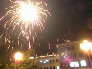 潘村湖农场于12月8日晚在场部大院举行了盛况空前 的烟花燃放活动,以烘托场庆50年期间热烈欢快的 节日气氛。当晚有数百名职工群众在现场观看了烟 花燃放盛况。图为烟花燃放时的壮丽景致。(杨登 宏摄)