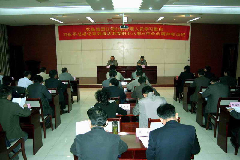 41424,省农垦集团中层干部集中轮训班在安徽社会主义学院举行,学习领会习近平总书记系列讲话和党的十八届三中全会精神,深入贯彻中央、省委及省国资委党委全面深化改革的部署要求。党委书记、董事长田文俊和党委副书记、总经理李卓民分别作一、二期动员讲话和首场辅导报告,纪委书记储诚胜主持培训并作小结,集团机关中层干部和所属各农场、各全资及控股专业公司领导人员共计130人分两期参训。