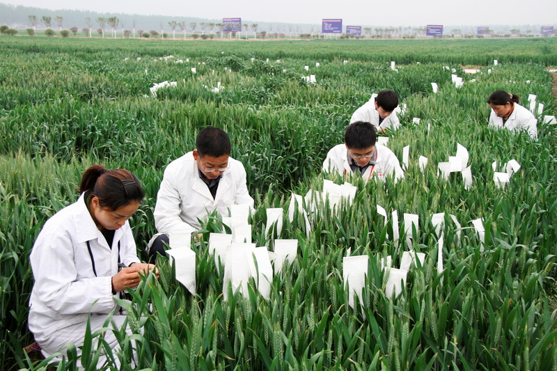 418,安徽农垦龙亢农场现代农业科技园区里小麦杂交育种全面开展,农业科技人员正在做小麦杂交授粉。今年,该农场计划做小麦杂交组合2600多个。