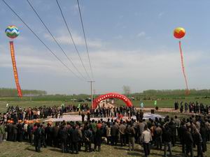 工程监理单位和施工单位的代表也在开工典礼上做 了表态发言。接着,在喜庆的乐曲和礼花爆竹声 中,各级领导和来宾为工程奠基。参加奠基仪式的 有:省农垦集团公司副总经理刘超、李家堂,明光 市领导,集团公司有关处室的负责同志,明光市有 关部门的领导,部分兄弟农场的代表,场领导班子 成员,潘村镇及有关站所的代表,本场老同志代表 等。场属各单位管理人员和职工代表约200人参加 了工程典礼活动。图为开工典礼场景。(杨登宏 摄)